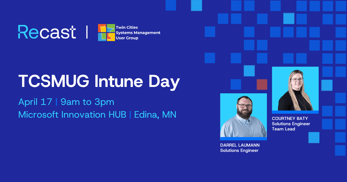 Join Recast at TCSMUG Intune Day on April 17 for a focused look at modern endpoint management with Intune. Discover how Application Workspace and Recast tools help streamline app delivery, improve efficiency, and make managing endpoints easier at scale.