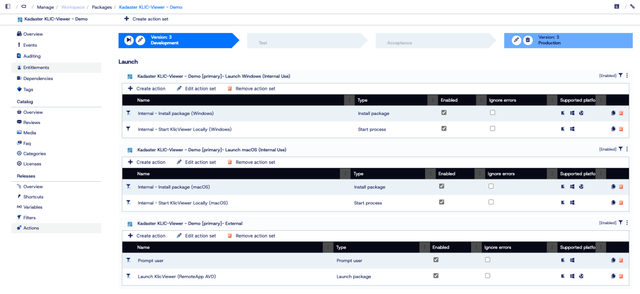 To start, we configure a custom package that contains three action sets. Each action set includes steps that call the individual packages (including OS-specific packages), so every possible path is managed under one “roof.”