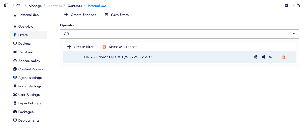 - Is the network context true, based on whether the current IP address falls within the internal network’s normal IP range?