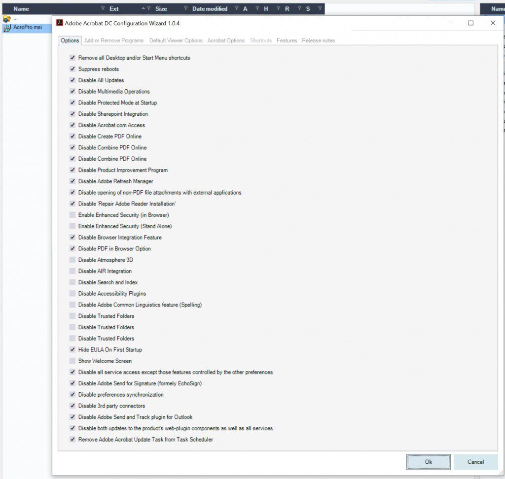 Every setting which enterprise customers normally use in an MST for Adobe DC are already pre-checked and set in the Configuration Wizard. Review these settings and then save the AcroPro.mst in the same directory as the MSI.