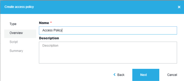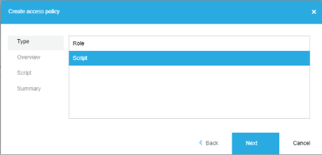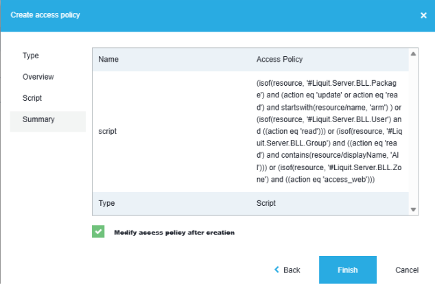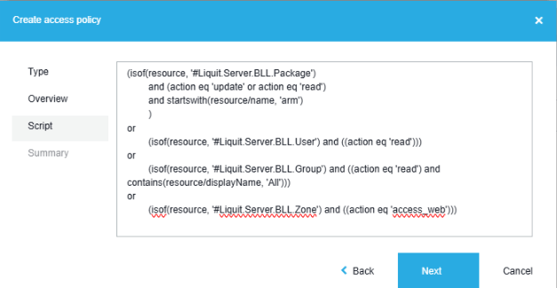 (isof(resource, '#Liquit.Server.BLL.Package') and (action eq 'update' or action eq 'read') and startswith(resource/name, 'WIN')) Now that we have all the syntax we need, we can create a script type Access Policy: