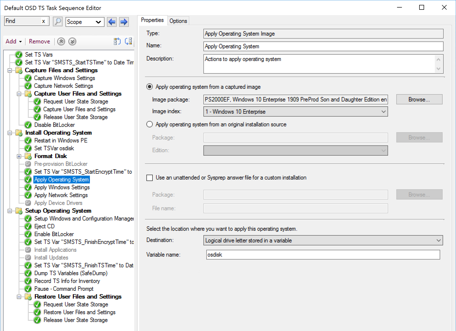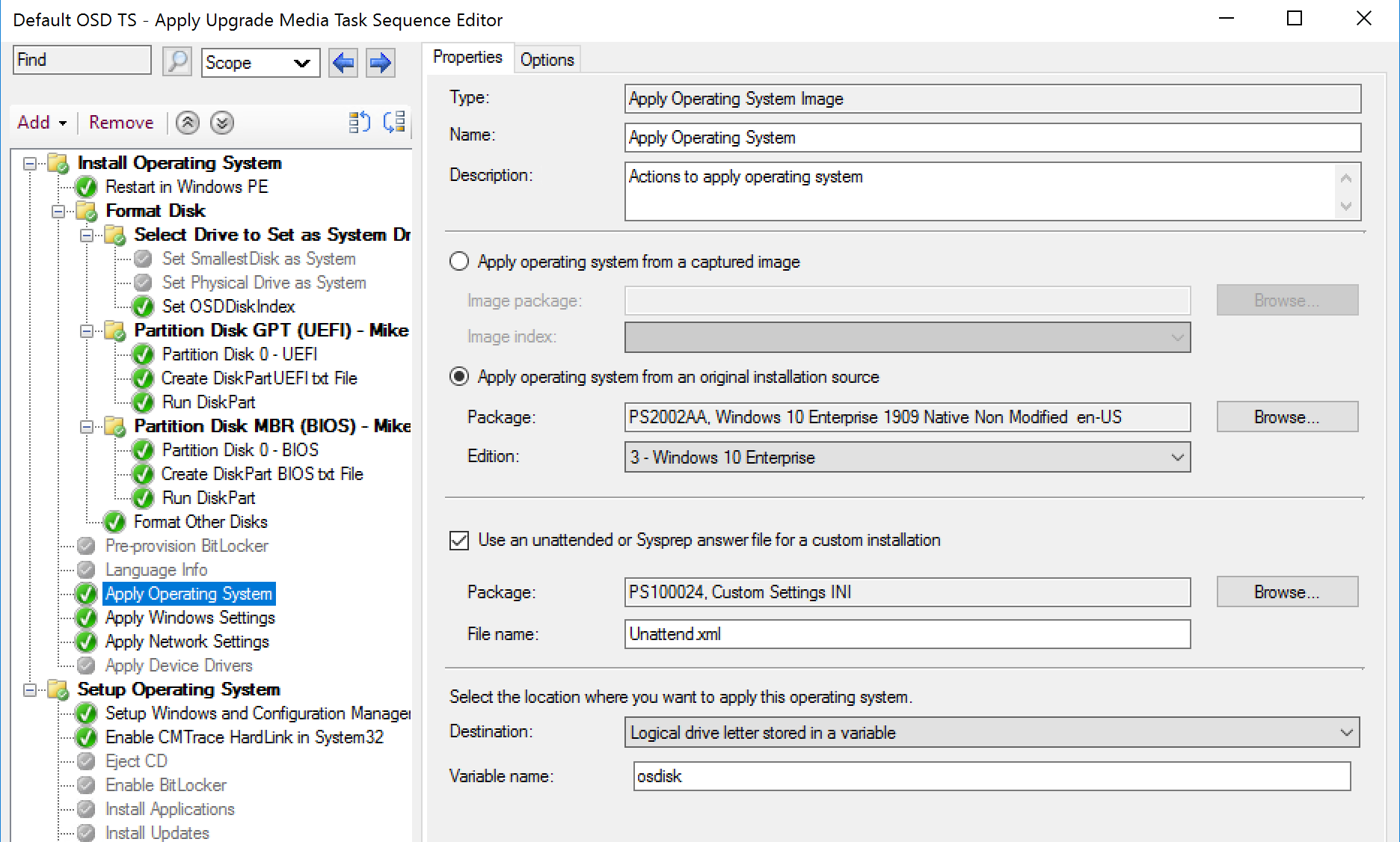 This step is one the building blocks of OSD, it takes your Windows Image and applies it to the machine. You really should read the MS Docs if you’re in charge of OSD at your organization. This step does A LOT!! It wipes the contents of the drive (leaving your USMT data of course), creates the unattended files needed for silent installation, or merging with your provided files, and gives you options for applying a WIM or Full Media (Upgrade Package).