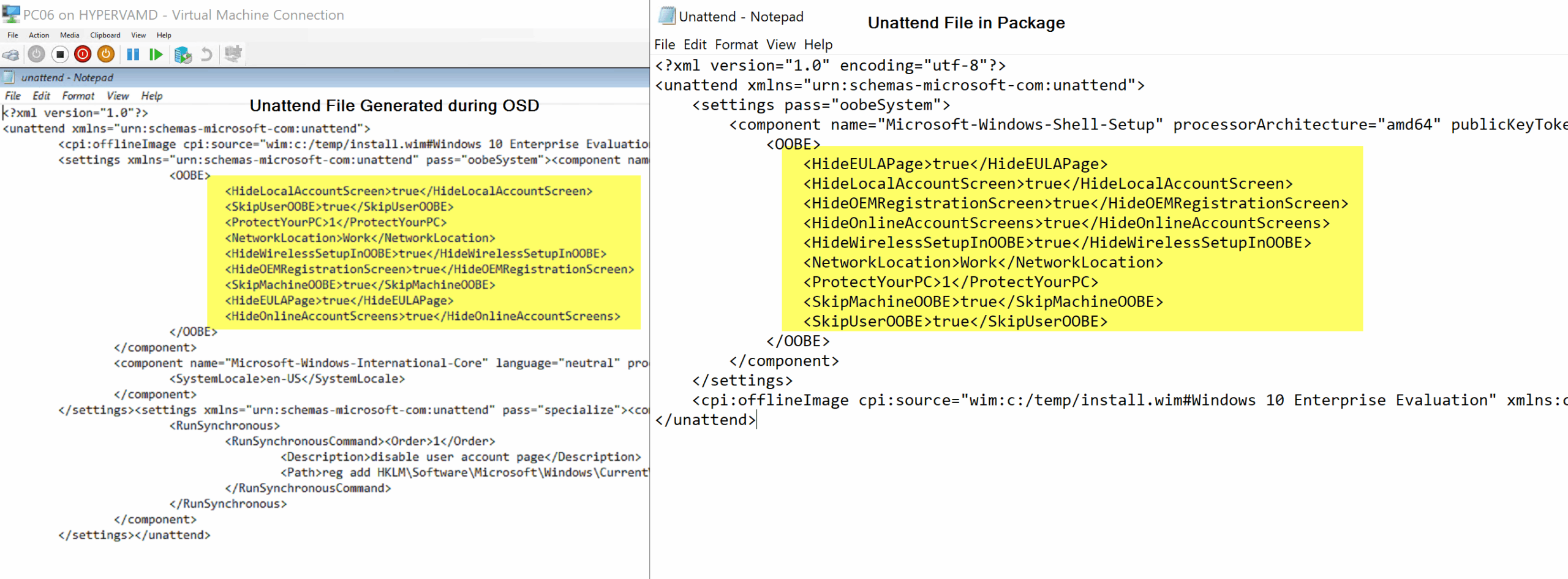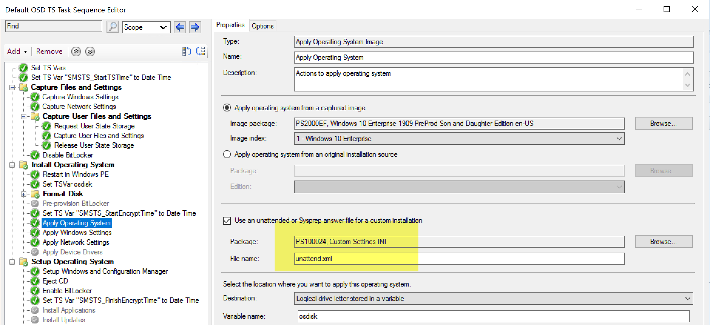 - While not required, this gives a way to add a lot of customization into Windows. However, I found this to also be one of my largest pain points by having settings in the XML file that were not compatible or causing errors in other ways. If you use one, keep it simple and test with each build. I will demo below with an unattend.xml file, so you can see how it gets “merged” with the one CM builds dynamically during OSD. (Demo 1)