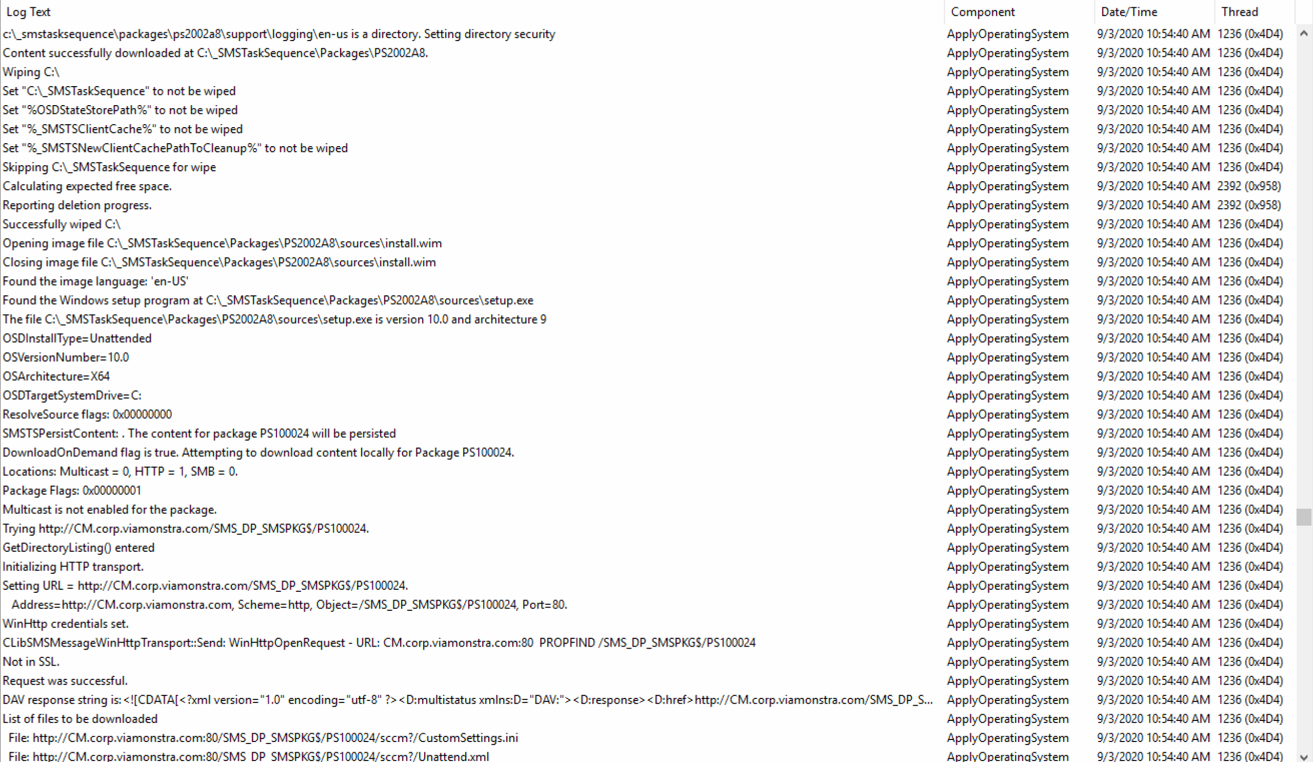 The Step starts basically the same, relies on the OSDApplyOS.exe CM tool, then determines the volume to install the OS onto, then starts to download the Package. This is where you’ll see a difference as when you apply a WIM, it downloads 1 file whereas here it downloads the entire media. (Download Starts above, goes for about 3 minutes and ends in the image below)