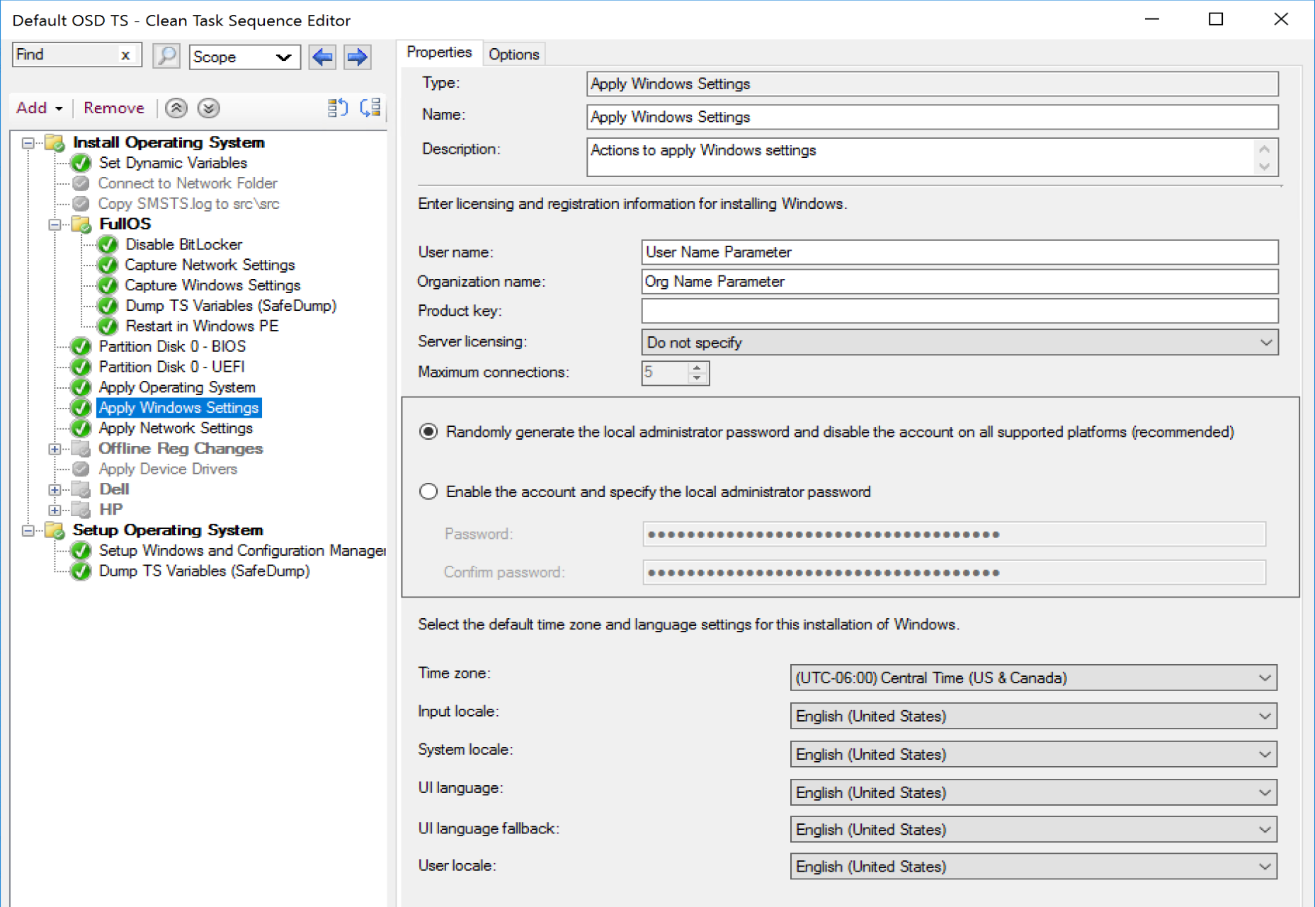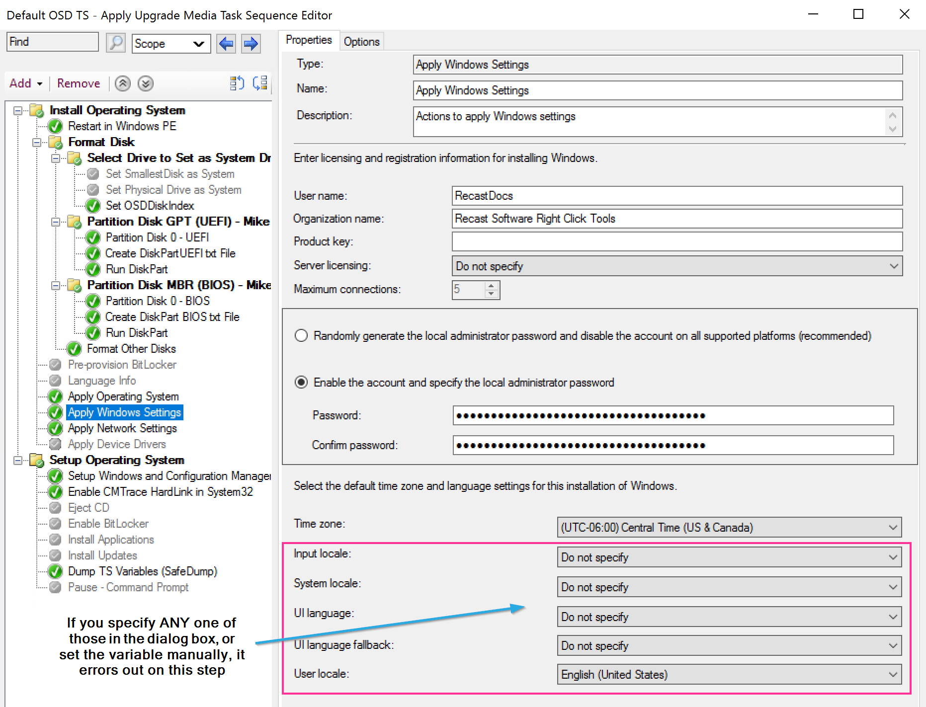 I then tried to modify the settings in the “Apply Windows Settings” step to see if I could get it to be fully unattended, but I received Errors each time. I did NOT have this issue when applying a WIM instead of using OS Source. This seems to only happen in this scenario.