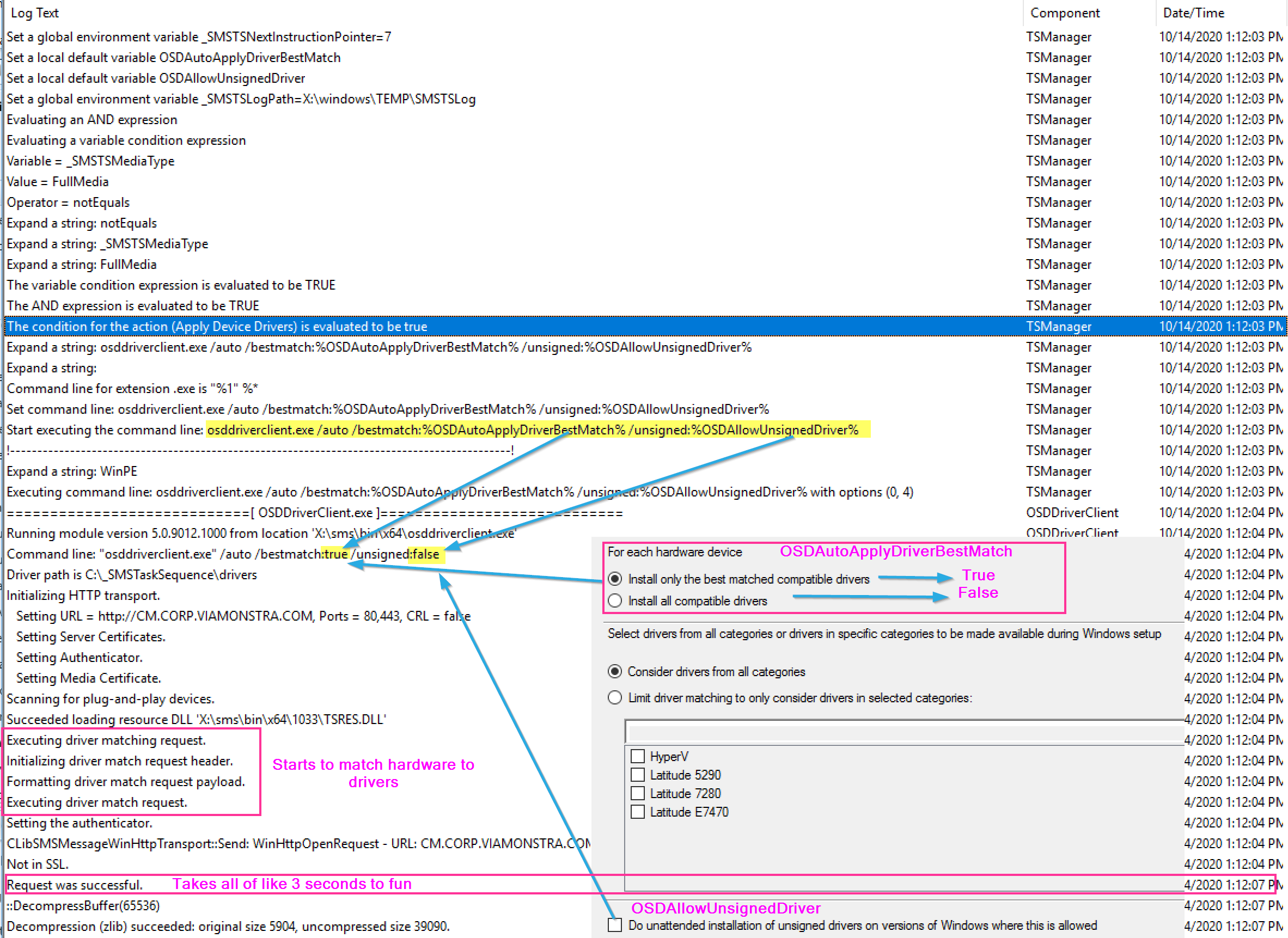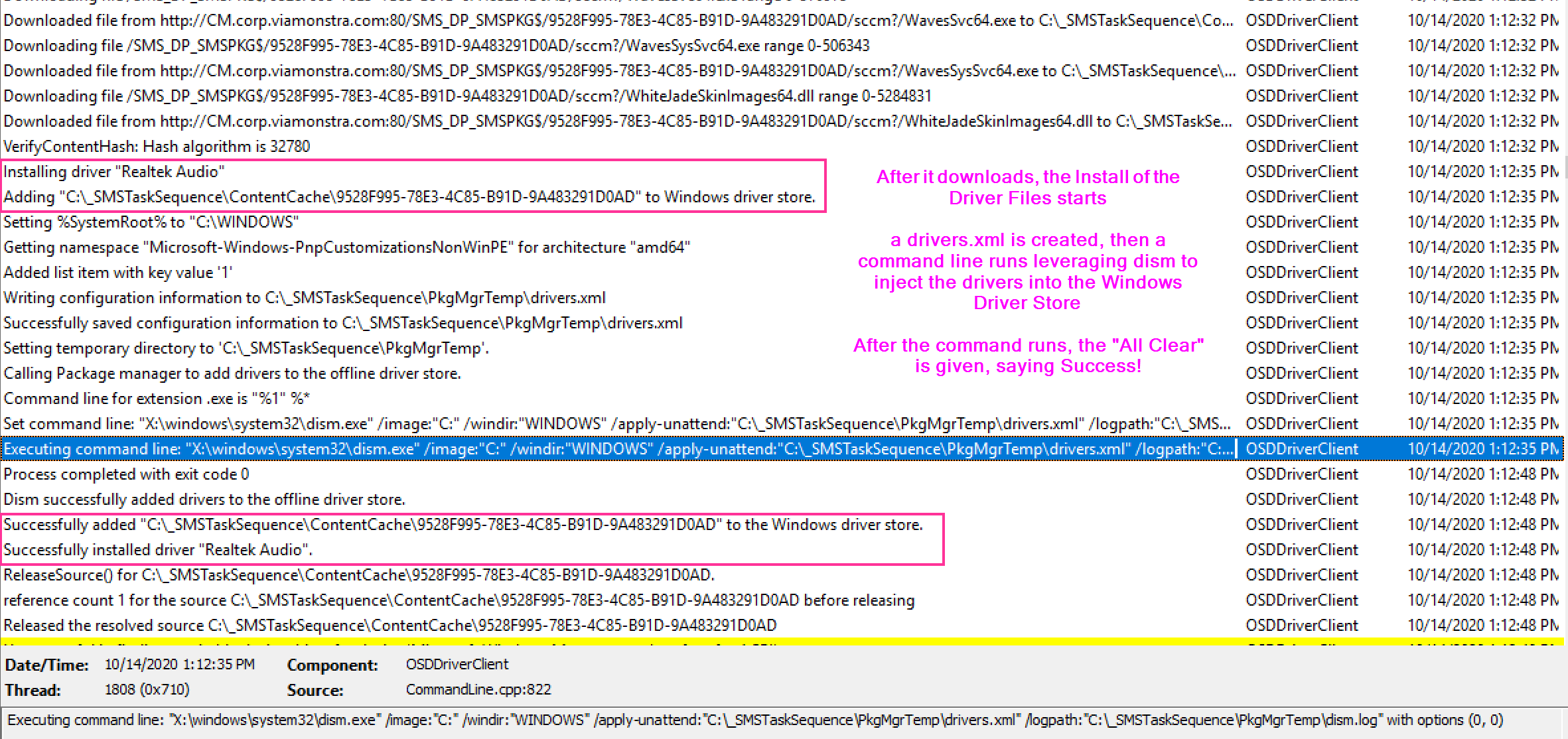 For Each Hardware ID, The TS Reaches out, pulls down the driver, runs dism to inject it into the Windows Driver Store. This part of the log can get quite long.