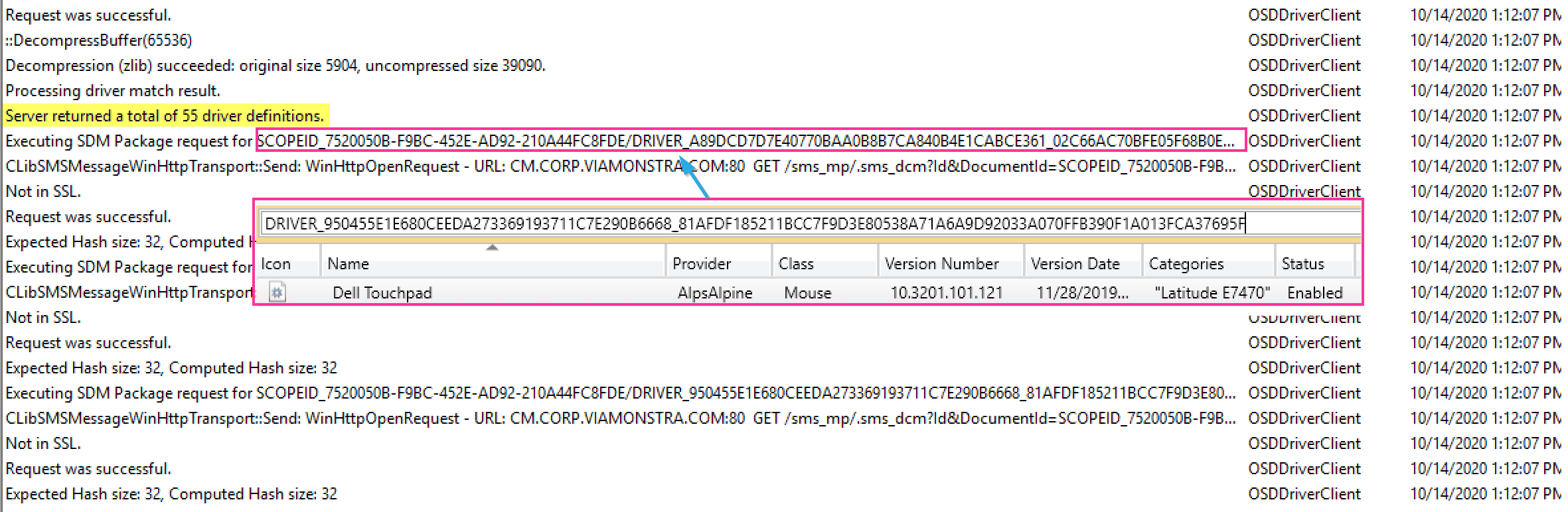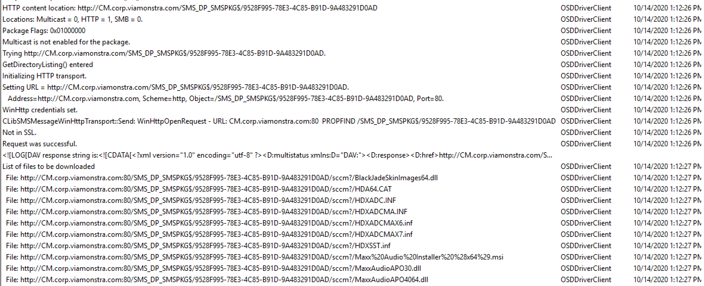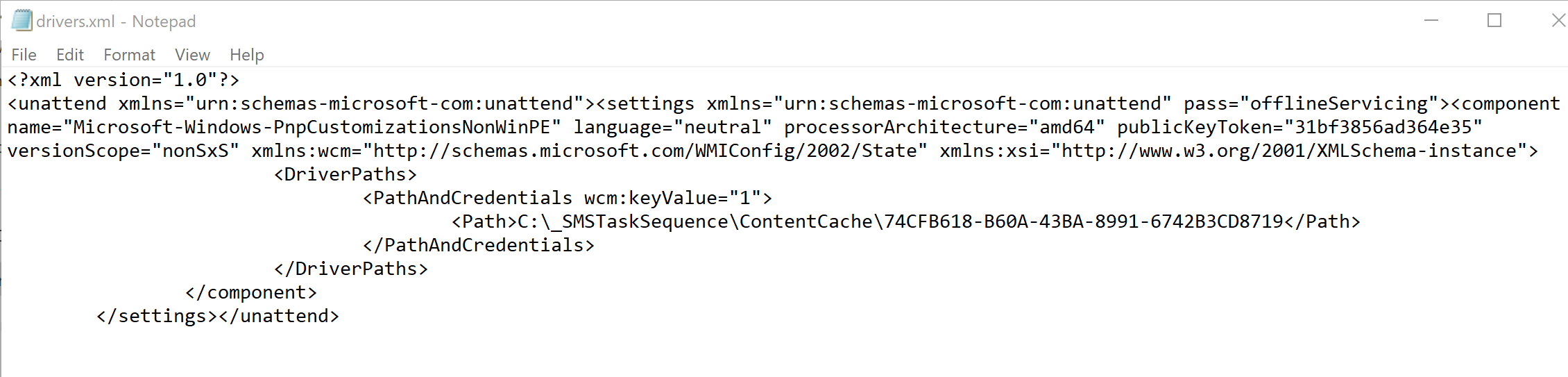 The Driver.XML & DISM.log are created the temp location C:_SMSTaskSequencePkgMgrTemp for each driver. It’s created and deleted very quickly, so it’s hard to grab a copy during OSD for Demo. The XML file looks like this every time, other than path.