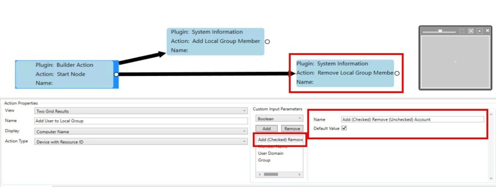 We added the “Remove Local Group Member” and added the “Arrow” to connect the Start Action to the Remove action. The setup is the same as the “Add Local Group Member”, it requires the same parameters. But now we need a way to let the Runner know which “Path” to take, Add or Remove. So we’ve added a Boolean (Check Box) to the form and named it accordingly. Then we just have to set the conditions on each action. Run “Add” if Checked, Run “Remove” if UnChecked.