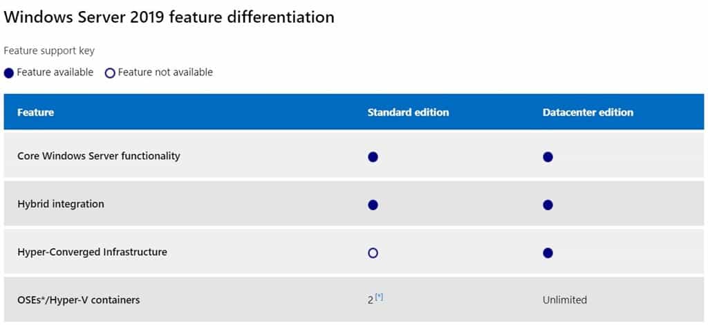 The table above shows that you get unlimited VMs with the Windows Server 2019 Datacenter Edition and two VMs for the Standard Edition. In either case, use the AVMA license keys (see list below) in order to activate the VMs on the server.