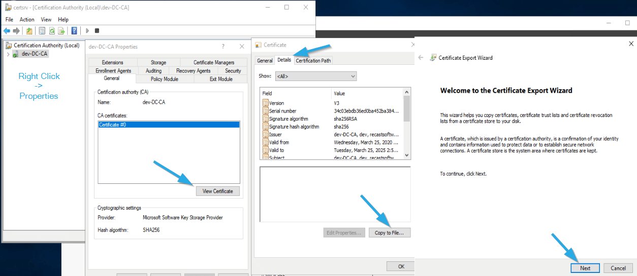 Certificate Authority Console -> Right Click on Server -> Properties -> General -> View Certificate -> Details -> Copy to file… -> Next