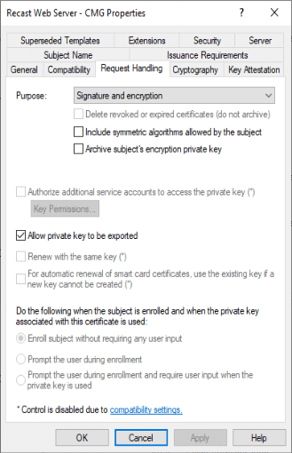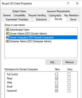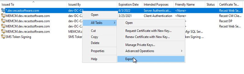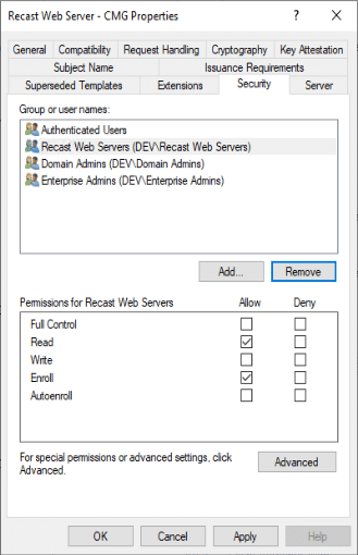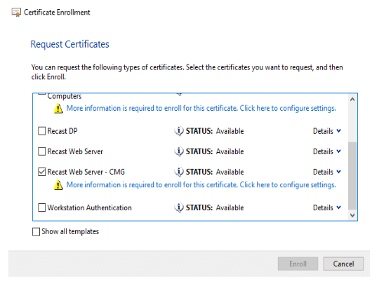 Here I’ve got it set to a group of servers, so I can enroll from any of those to create the cert to export. Now on one of my webservers, I can request the cert: