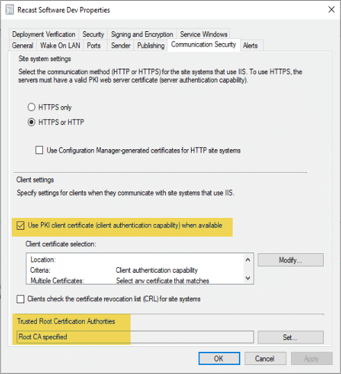 One more thing we’ll want to do in CM is allow CM to use the PKI cert. [MS Docs]