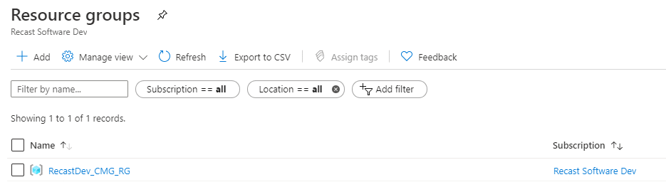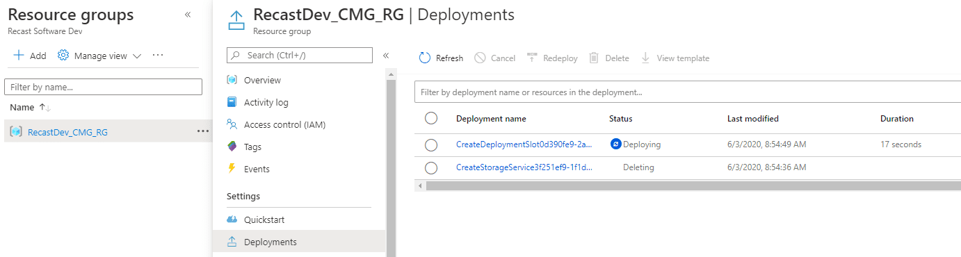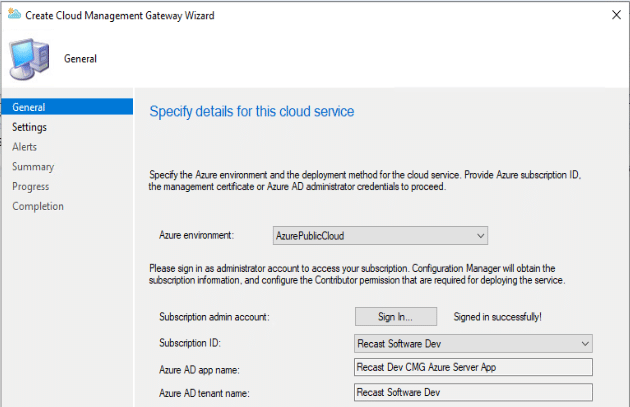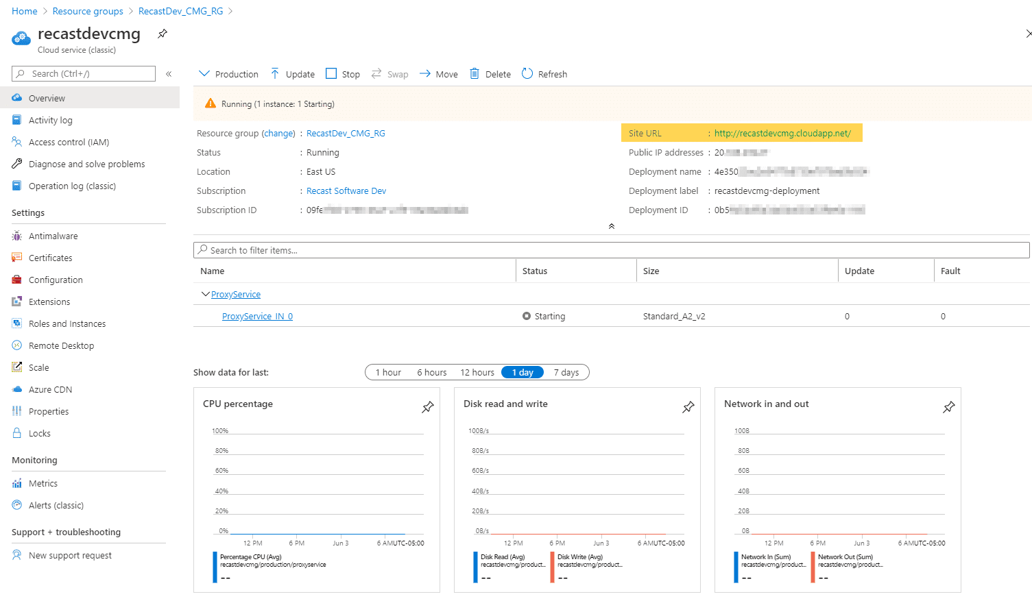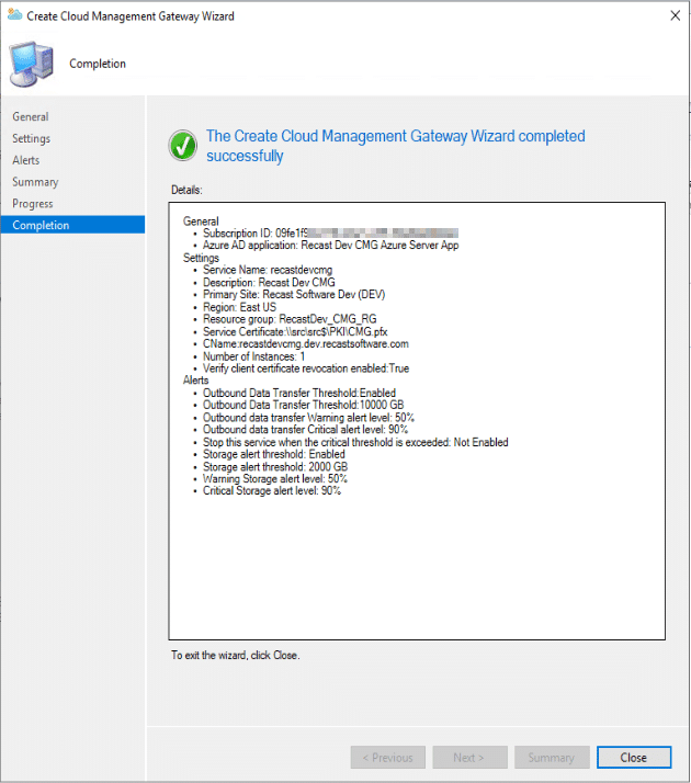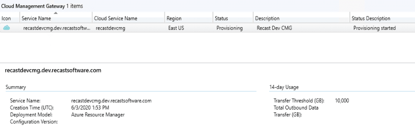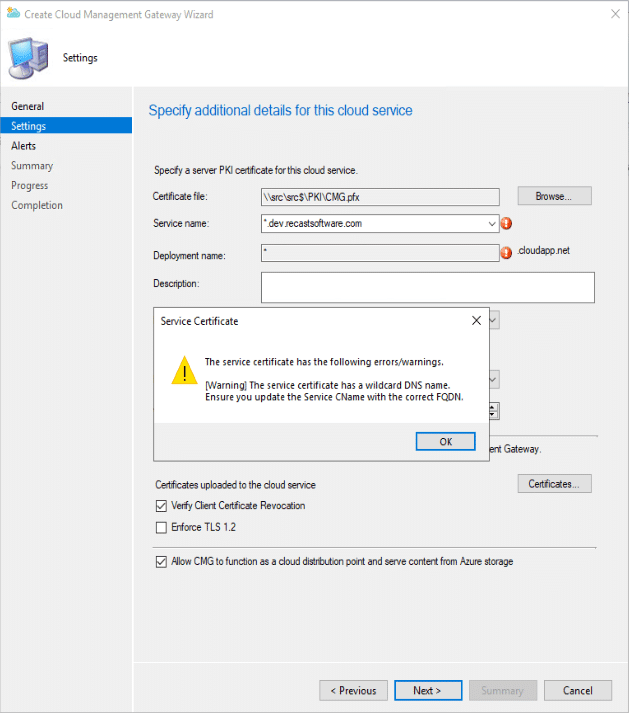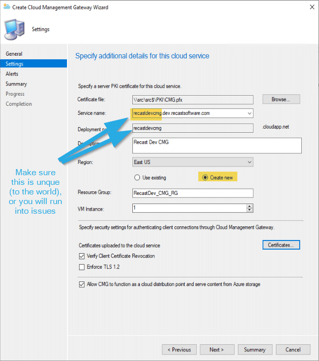 NOTE… YOU NEED TO SETUP A DNS ALIAS for your custom CMG Name [recastdevcmg.dev.www.recastsoftware.com] to the Microsoft backend name [recastdevcmg.cloudapp.net]. If you don’t have that in place, your clients and servers will not be able to communicate with the CMG in Azure.