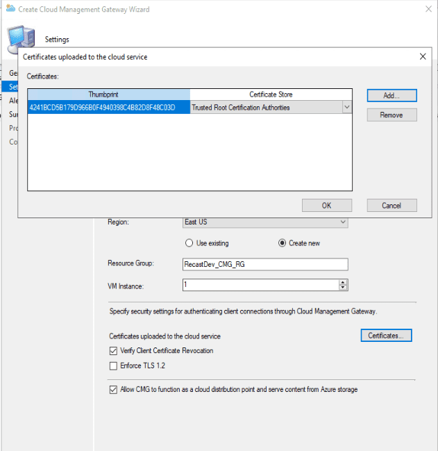 alright, going back to that last image, I found it easiest to have the wizard create a new Resource Group in Azure. I made sure it was a unique name, and one pretty easy to know what it was when you’re in the Azure Portal. Also please note, that you’re going to want to uncheck that box for “Verify Client Certificate Revocation” unless you don’t.. but if you’re not sure, then you’ll want to uncheck it. [MS Docs] (as shown below).. sorry I didn’t do that when I first set it up and was grabbing the screen captures, and I found it caused some issues. But it wasn’t really practical, but thankfully some of these settings you can change after the fact… like that one. I also checked the box to all the CMG to function as a cloud DP, which is pretty cool, and I’ve been doing tests with my client that doesn’t have a VPN connection back to the lab, and it’s great that I can install applications from the software center without being on the network. But I’m getting ahead of myself. While you’re still on the screen in the wizard you’ll need to load your CA Cert, which I’ll show below too.
