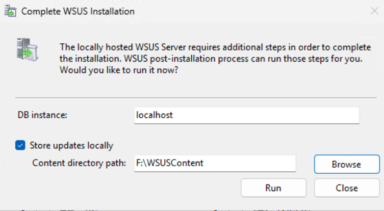 When asked to complete you will be prompted for a location for storing the WSUS Files.