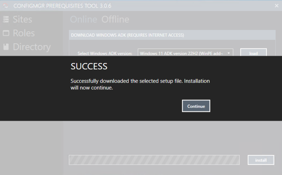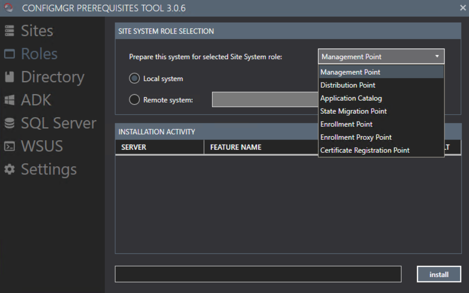 To begin, I’ve set the tools to install the prerequisite files for a primary site and clicked Install. During this install, it enables components like things like the .net framework, BITS, RDC, UpdateServices-RSAT.