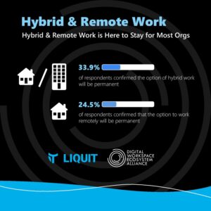 Organizations across all sectors are now struggling with delivering long-term work-from-home sustainability while enabling ongoing innovation and progress. This has led to a permanent but still shifting hybrid reality mix of work from home and in-office work. According to a recent Digital Workspace Ecosystem Alliance (DWEA) Survey, 33.9% of workers polled expect their employers to offer a hybrid mix of home and office work while 24.5% expect only working from home.