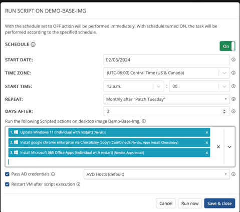 Nerdio allows admins to automate monthly patching tasks by scheduling automatic image updates out of hours on a repeated schedule. Nerdio also allows you to reimage a host pool with 3 clicks. Nerdio takes a patching task that would take on average 4-6 hours and completes it in under 30 minutes!