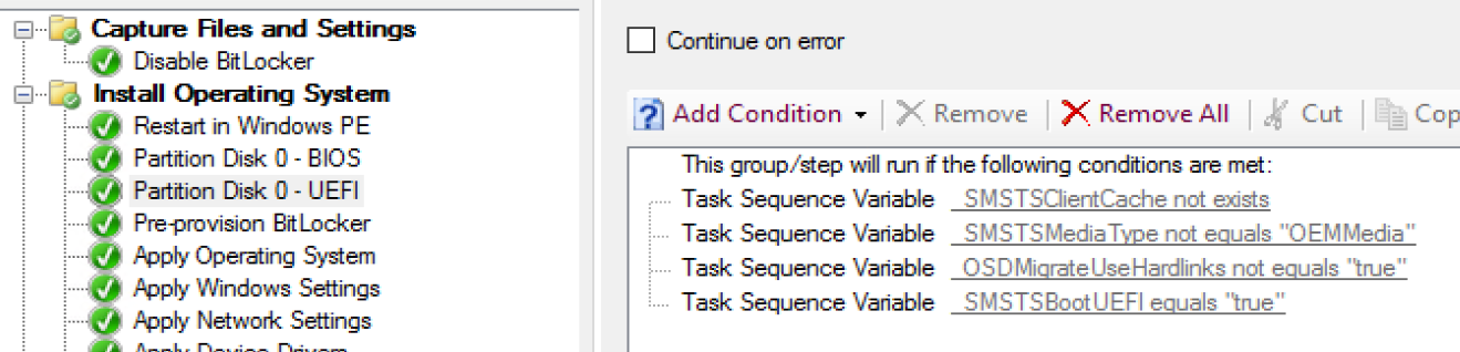 Default UEFI Format Step, you can see there are several rules in place before the format step would run. There are several safe guards in place to make sure it doesn’t format the drive if you’re doing a refresh and have data on the machine that is supposed to be retrained. [Based on build in task sequence variables]