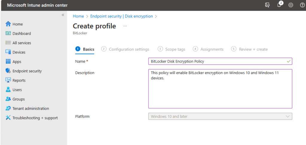 Select Endpoint Security on the left-hand panel > Scroll down and under “Manage” click on Disk Encryption > On the Disk encryption page click on + Create Profile > Platform: Windows 10 and later, Profile: BitLocker > click Create.