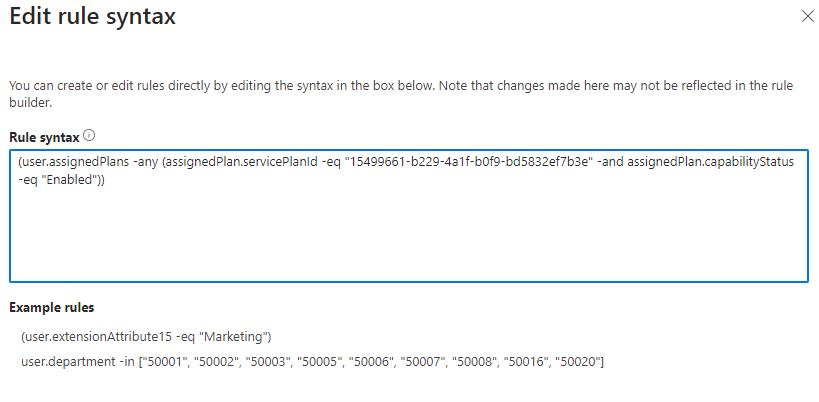 - In the “Rule syntax” box, input the following expression, replacing <servicePlanId> with the actual service plan ID you noted earlier:
