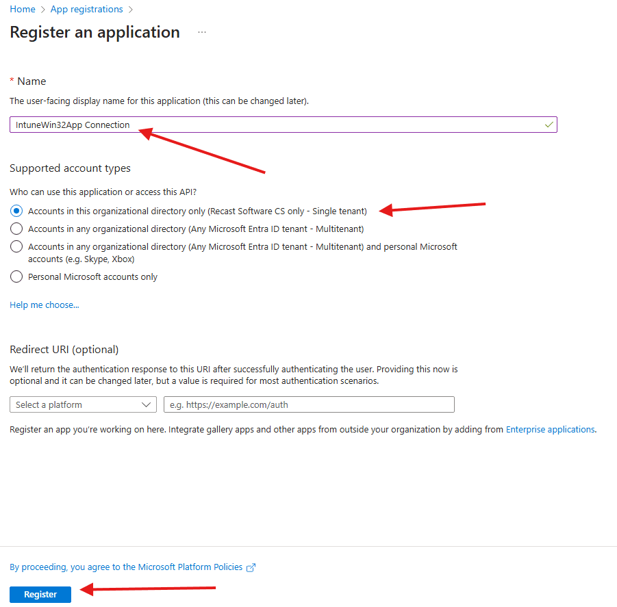 Enter a name (e.g., IntuneWin32App Connection).Choose Accounts in this organizational directory only. Select Register.
