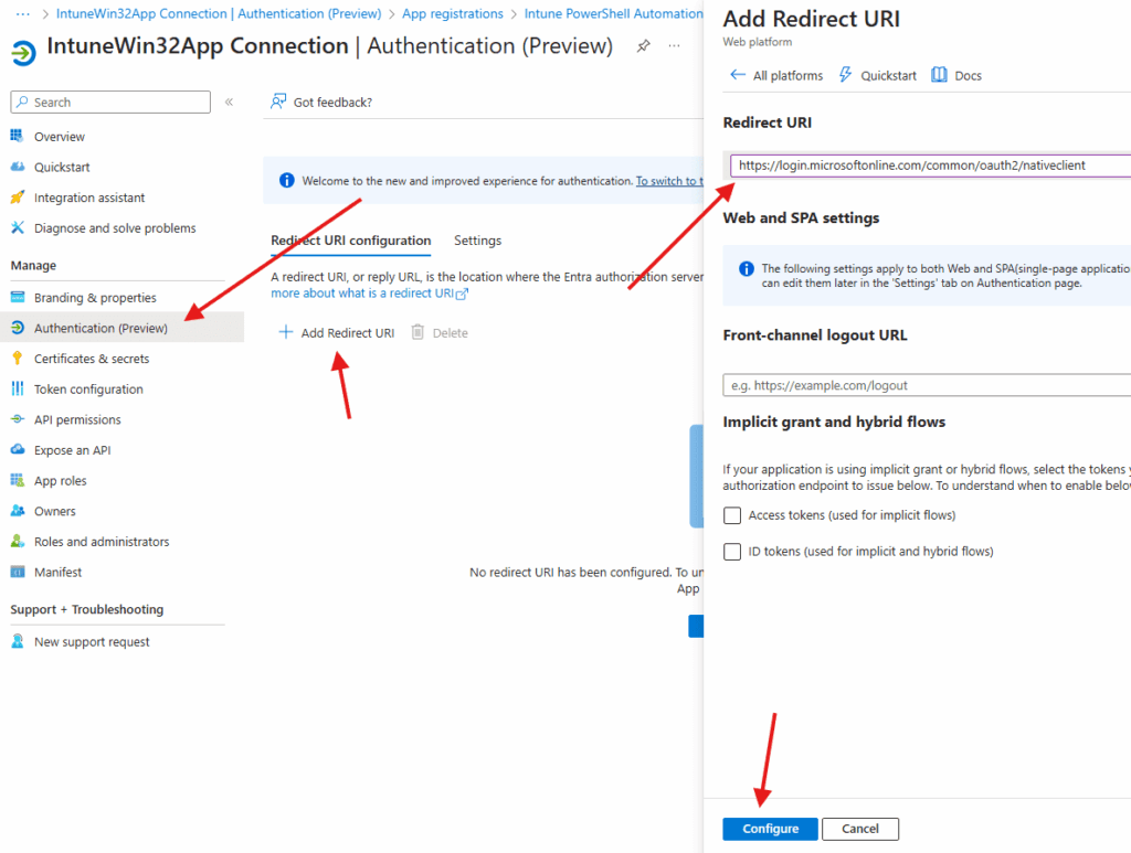You will also need to add something to authentication. Select Authentication -> Add Redirect URI: https://login.microsoftonline.com/common/oauth2/nativeclient. Then click Configure.