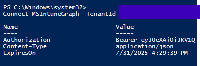 Connect-MSIntuneGraph -TenantId "your_tenant_ID" -ClientId "<your_client_id>" The first run prompts you to sign in to Entra ID, then returns a connection result.