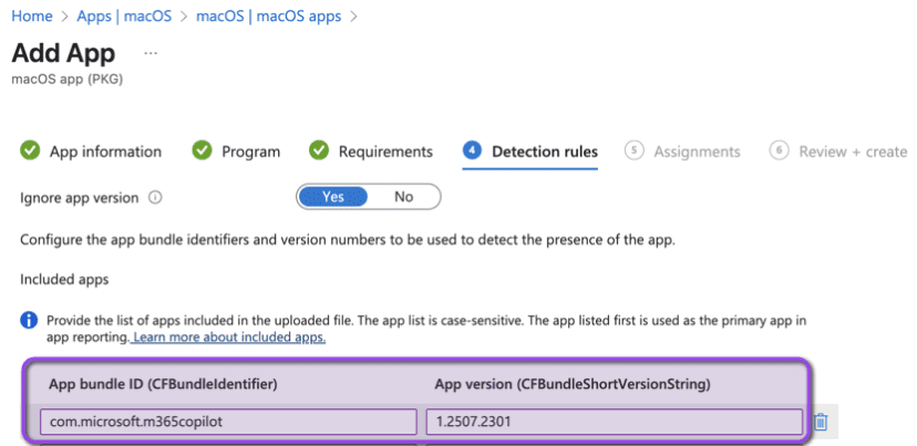 7. On the Detection Rules section, select “ignore app version” and set it to Yes. Then enter the App bundle ID and App version.