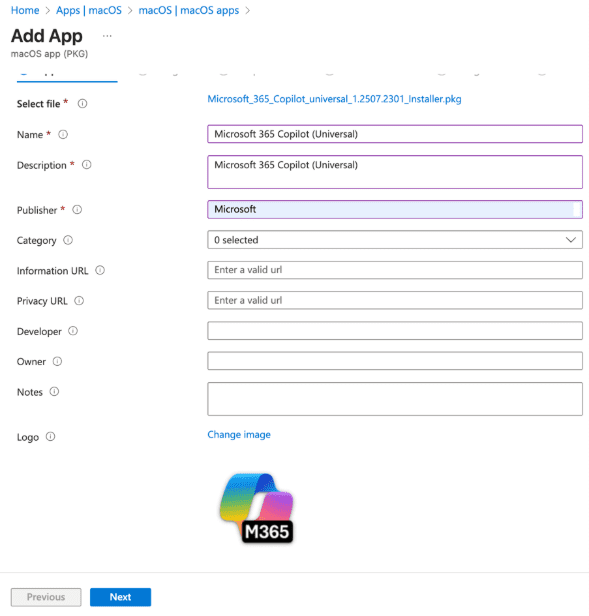 3. Select Select app package file. Browse to Microsoft_365_Copilot_universal_1.2507.2301_Installer.pkg and upload the file. Download the latest Microsoft 365 Copilot package from Microsoft’s release page.