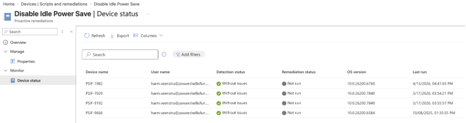 After creating and assigning the script to a test group (you can specify multiple groups with different intervals in which it should check the status using the Detection script), you can see the status of the Remediation for your devices and when the last run was triggered: