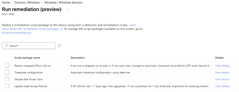 In the example below, I navigated to the PSIF-1982 device and selected Run remediation (preview) from the pull-down menu bar by selecting the three dots.