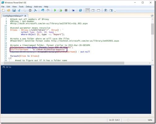 3. Edit the PowerShell script and change Line 21 to your ConfigMgr backup directory; add the folder called Reports. In my example below, D:CMbakRS2BackupReports, I highlighted the line. You will notice that the Data&Time variable is no longer used.
