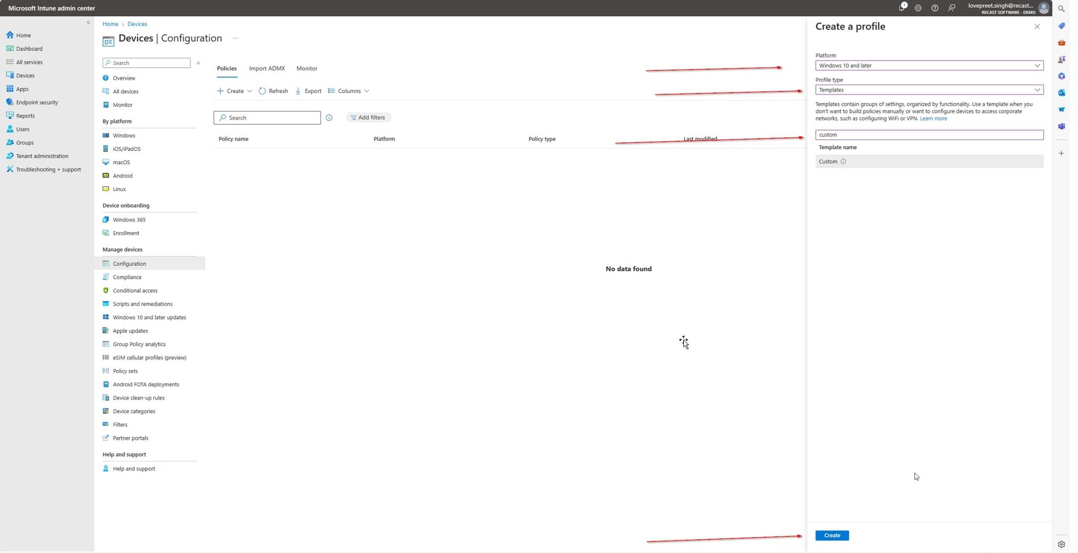 - Click on Create Profile > New Policy. Select Windows 10 and later for platform.