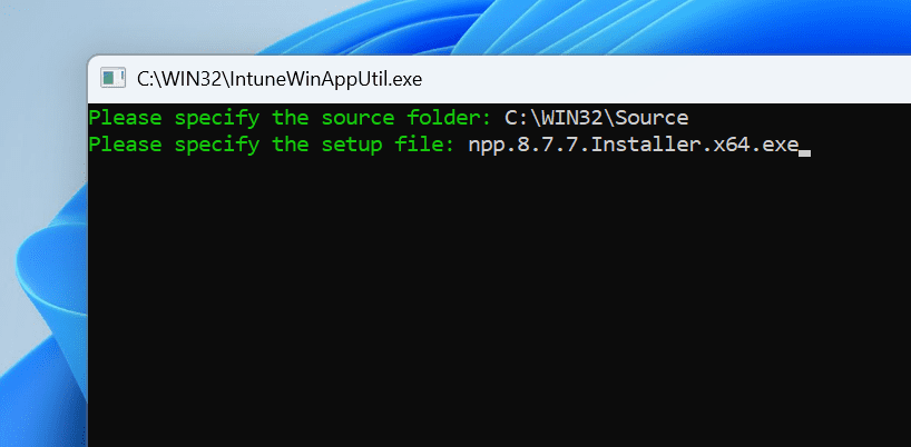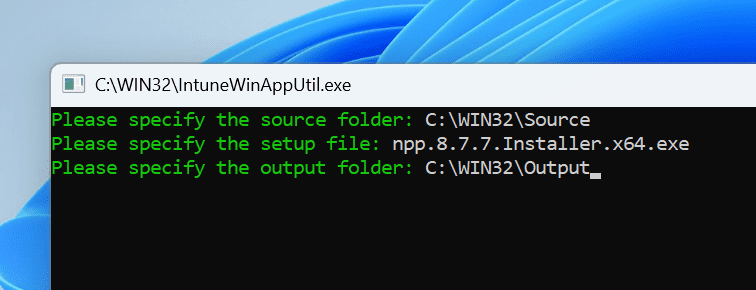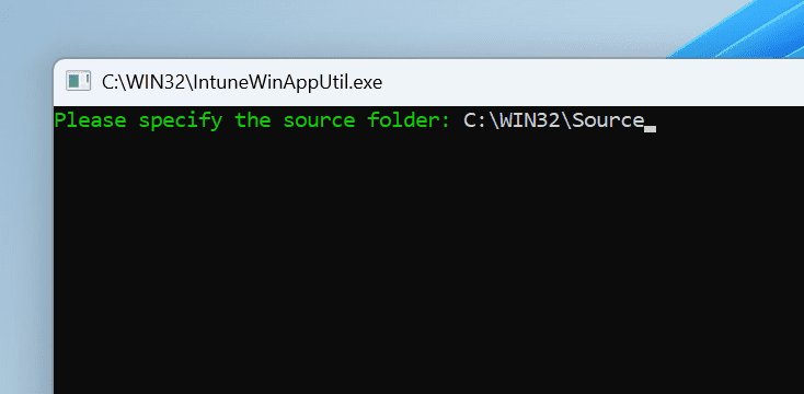 Step 5: Running the tool opens a console window. Here in the first section, you want to specify the source folder, which in our case is located at the C:WIN32Source path. This is essentially where we added that .exe application that we want to convert to a win32 app.