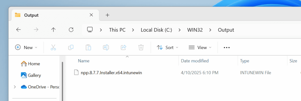 Step 9: After the process completes, confirm that Notepad++_8.7.6.intunewin appears in C:WIN32Output.