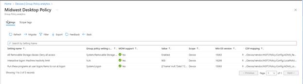 For now, I will go back to Group Policy Analytics and select the GPO that has 100% MDM support and select Migrate.