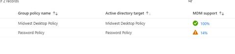 Once we have imported those, you will see your Group Policies displayed on the screen. In this case, I added both Midwest Desktop Policy and Password Policy. We can see that Midwest Desktop Policy is 100% MDM Supported, which means all the settings in the GPO can be migrated to CSP.