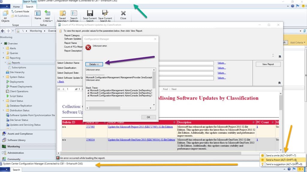 If you want to send a frown (or maybe a smile) based on an error message, there’s a simple work-around. In most cases the error message window will block access to the smile button, so simply open a second SCCM console window and then send the frown or smile from that window! By the way, this is a known issue.