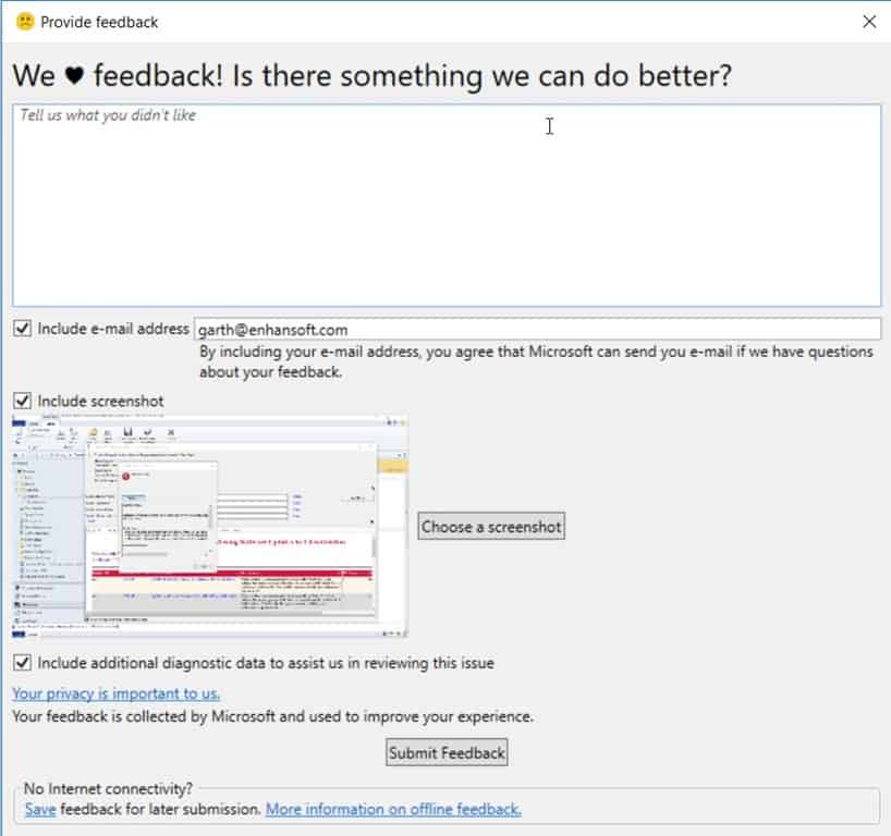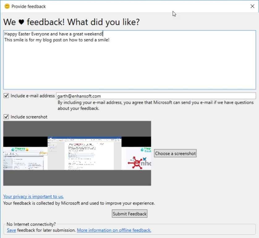 Provide enough details under the feedback section for the product team to understand why you are sending a smile and then enter your email address. By default, a screenshot of your screen is taken and attached to the feedback form.