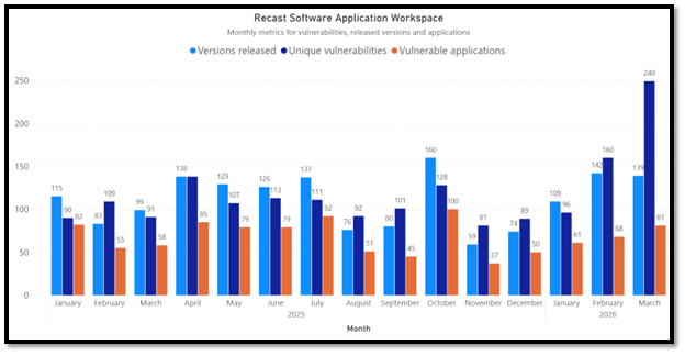 March marked a clear increase in vulnerability and remediation activity compared to February. We identified 249 unique vulnerabilities affecting 81 applications, and remediation work resulted in 139 unique updates during the month. Both the volume of findings and patching activity rose notably, making March one of the more active periods so far this year.