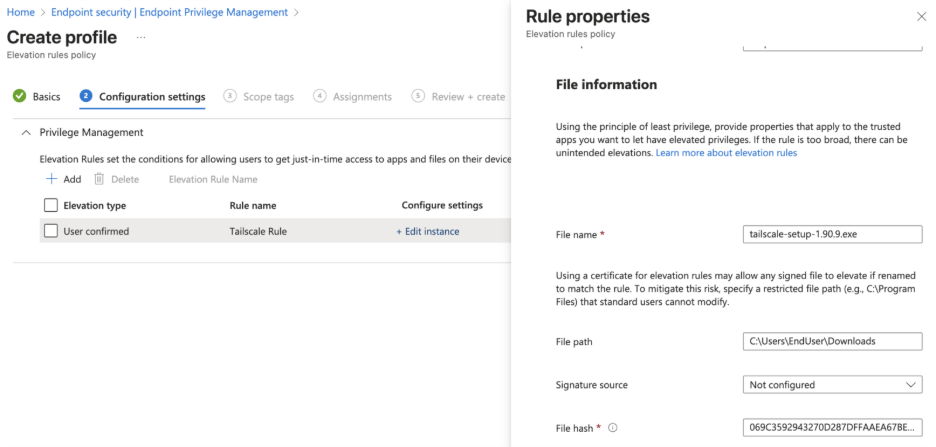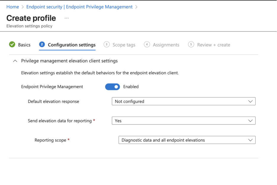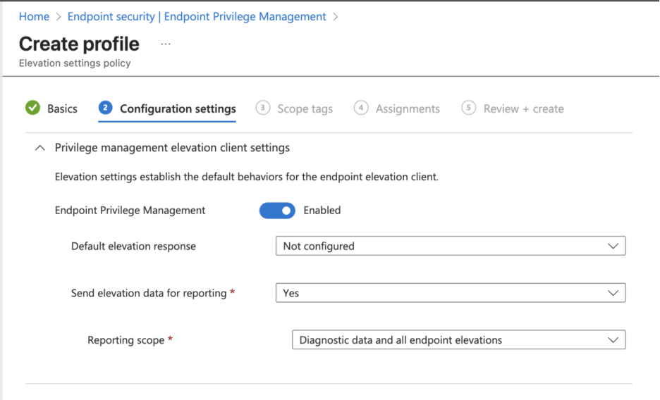 Because EPM is built into Microsoft Intune, it’s straightforward to turn on as you move toward a zero-trust model. You will need to enable the Endpoint Privilege Management agent so that the device can check in and complete the onboarding. We can do this by setting up an Elevation Settings Policy profile in Intune and making sure Endpoint Privilege Management is set to Enabled.