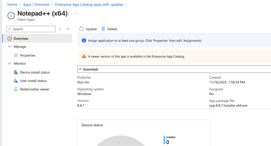 Alternatively, you can update your apps when new versions appear under Apps in Microsoft Intune. For instance, after deploying Notepad++ (version 8.8.7), you’ll be alerted that Notepad++ (version 8.8.9) is now available. At this point we would need to create a new app and supersede the provisioned version.