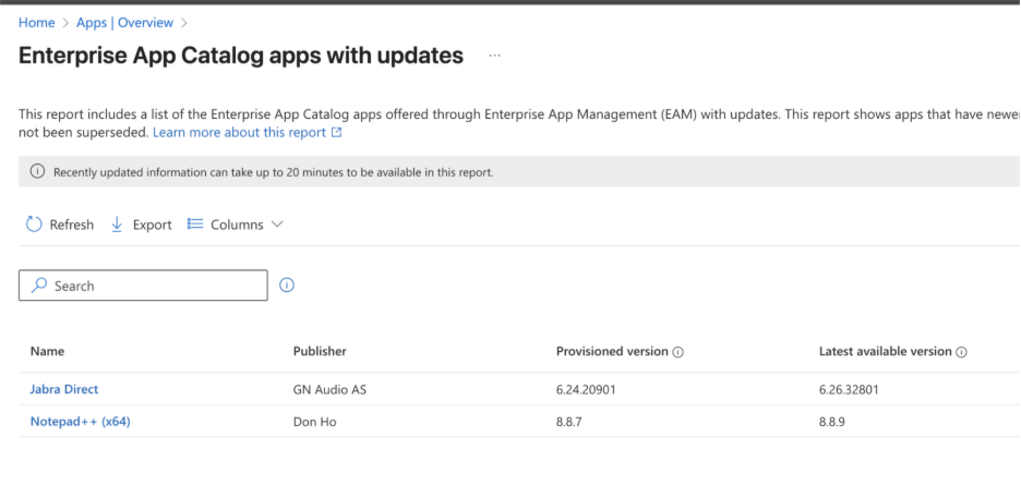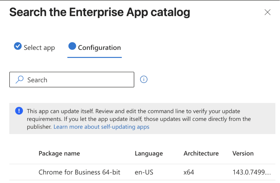 In this section, we’ll look at the different ways Microsoft EAM updates applications. The most hands-off capability is Self-updating apps; these applications follow the vendor’s own update process. One example is shown in the screenshot below.