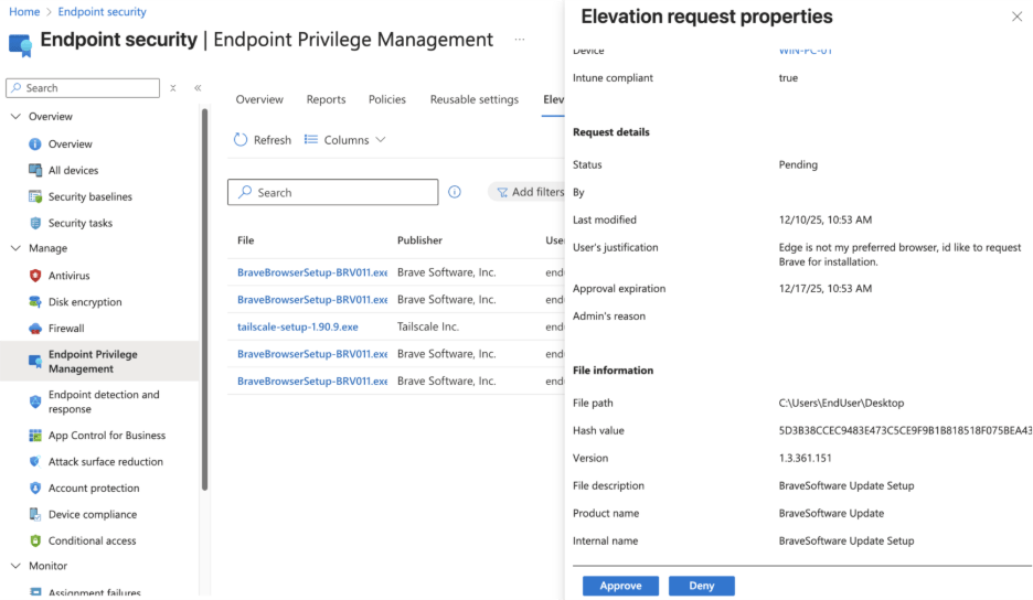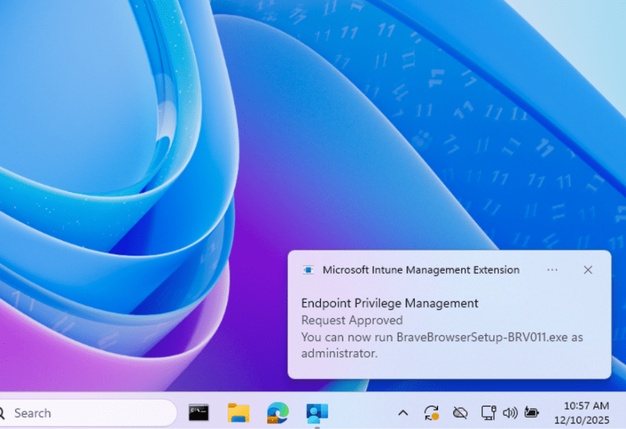 With this setting, end users can request elevation, but your IT team has to approve the request before anything runs. I’ll show you how this looks from the end user’s perspective if they want to install a new browser. In this flow, the user requests elevation to install the browser, and that request goes to the Intune portal for IT to approve or deny. If approved, the end user would get a notification letting them know that they can run with elevated access.