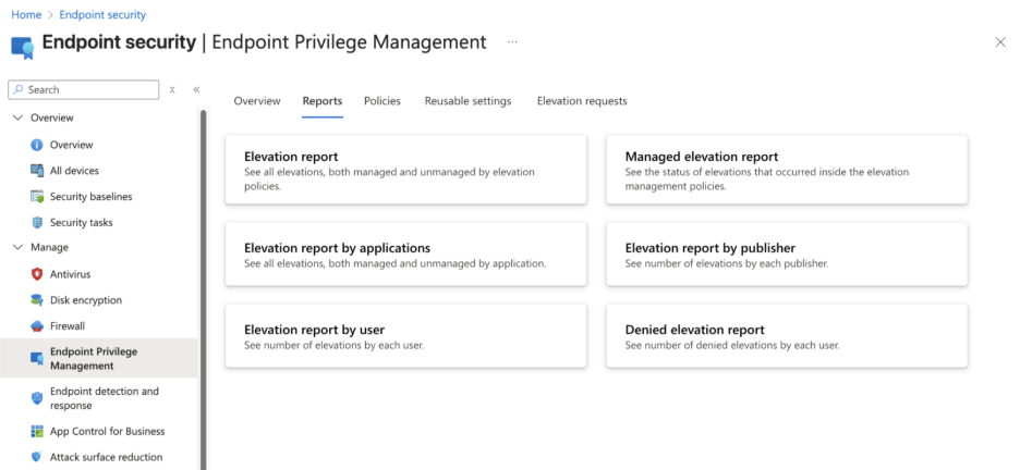 Those audit logs help you see how users are requesting elevation and refine your rules based on real activity. If you ever go through a breach (fingers crossed, you don’t) you can trace the actions taken. I’ve outlined the main reports you have access to in the screenshots below.