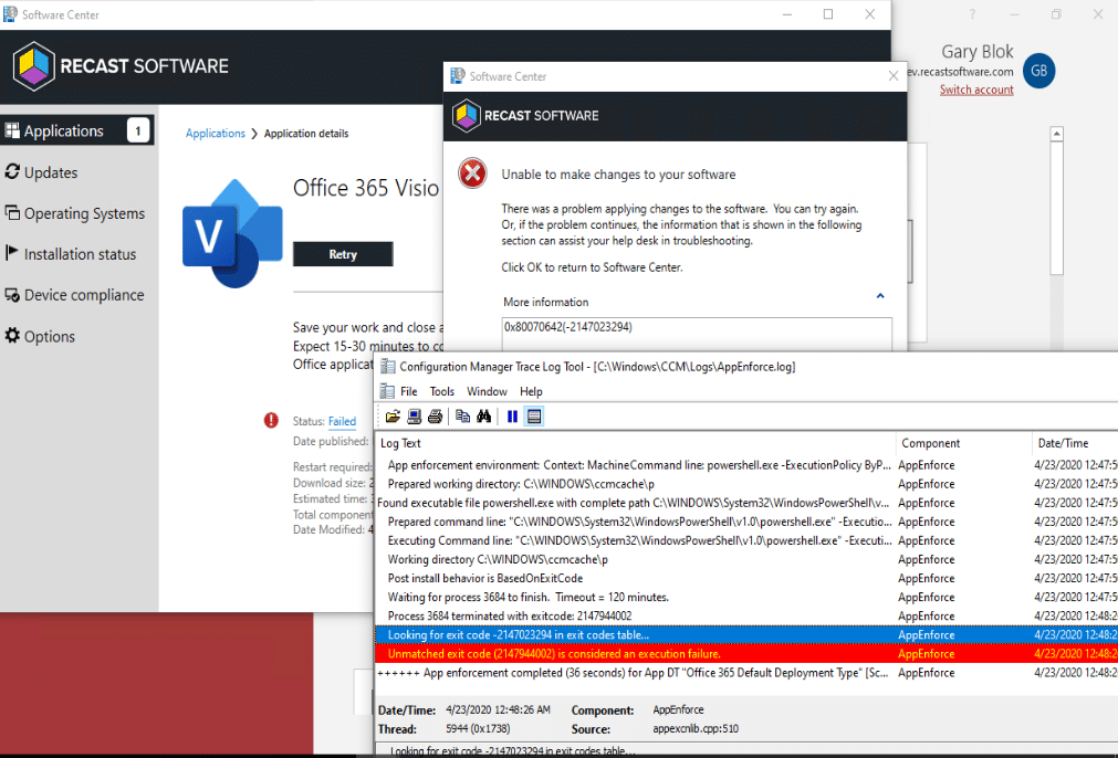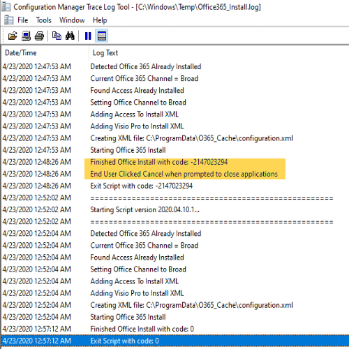 So basically, the ONLY time it actually force closes the apps is when it reaches the deadline and triggers automatically. Any other time it will prompt the end user to close the app and if the user clicks cancel, it throws and error. Remember, when it force closes the app, there is potential for lost work. I’ve confirmed this in my testing — the unsaved documents are gone, not recoverable.