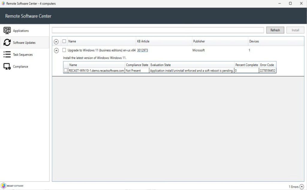 Launching the “Install Missing Software Updates” brings us to the “Software Updates” Tab in the Remote Software Center, and allows us to take action to trigger installing a missing patch on the machines.