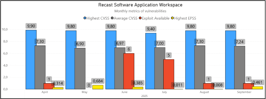 Highest CVSS and average CVSS continue to follow very similar trends compared to earlier months. There is also only one confirmed exploitation in the wild when considering these applications. The highest EPSS rating took a jump to 0.461.