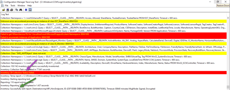 For example, if you look at the purple arrow and noticed the red highlighted line, you will assume that the hardware inventory failed. But if you looked closely a few lines later you will see that the inventory was sent to your MP correctly. Context is important when reviewing the log files.